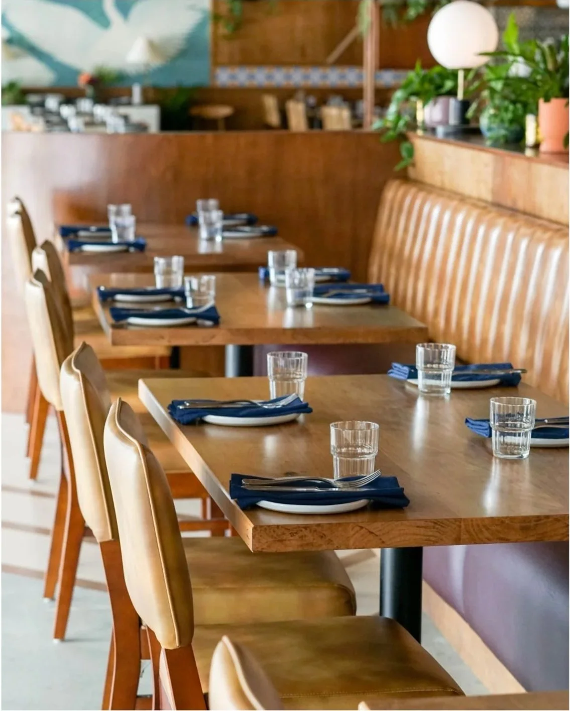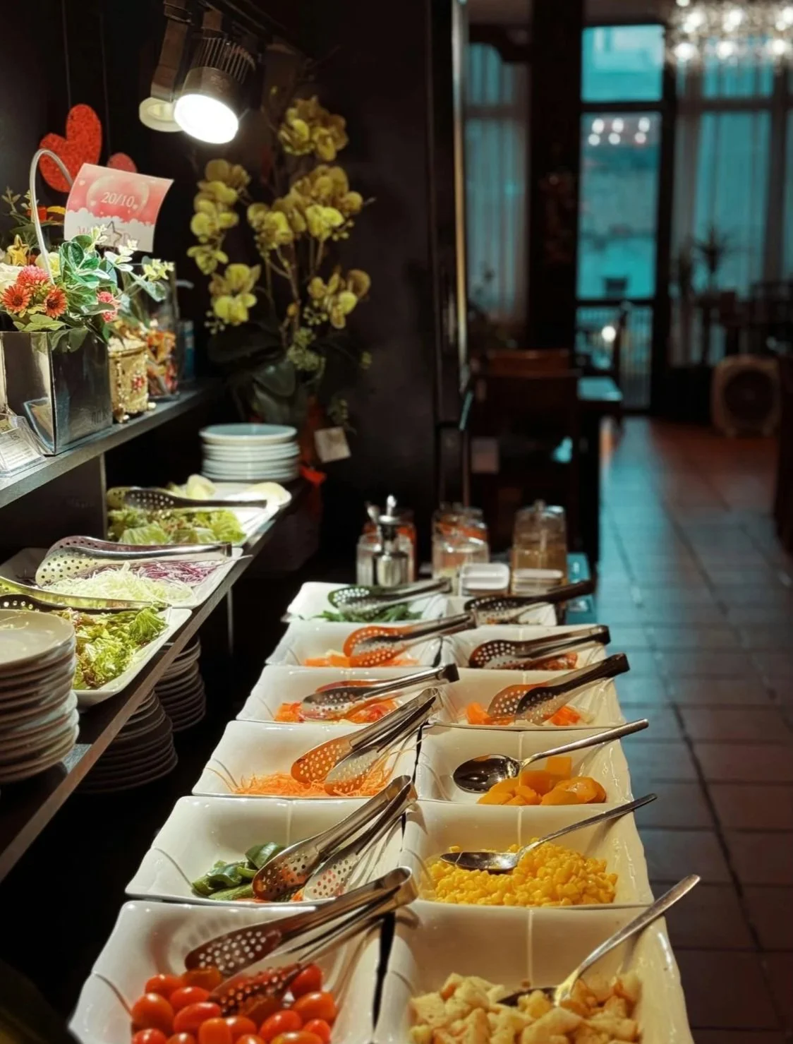 Materiales: deben ser de alta resistencia: pisos de tráfico comercial, barras de comida, dispensadores, bandejas y demás en acero inoxidable, mobiliarios metálicos en hierro o en madera laminada con alta durabilidad.
